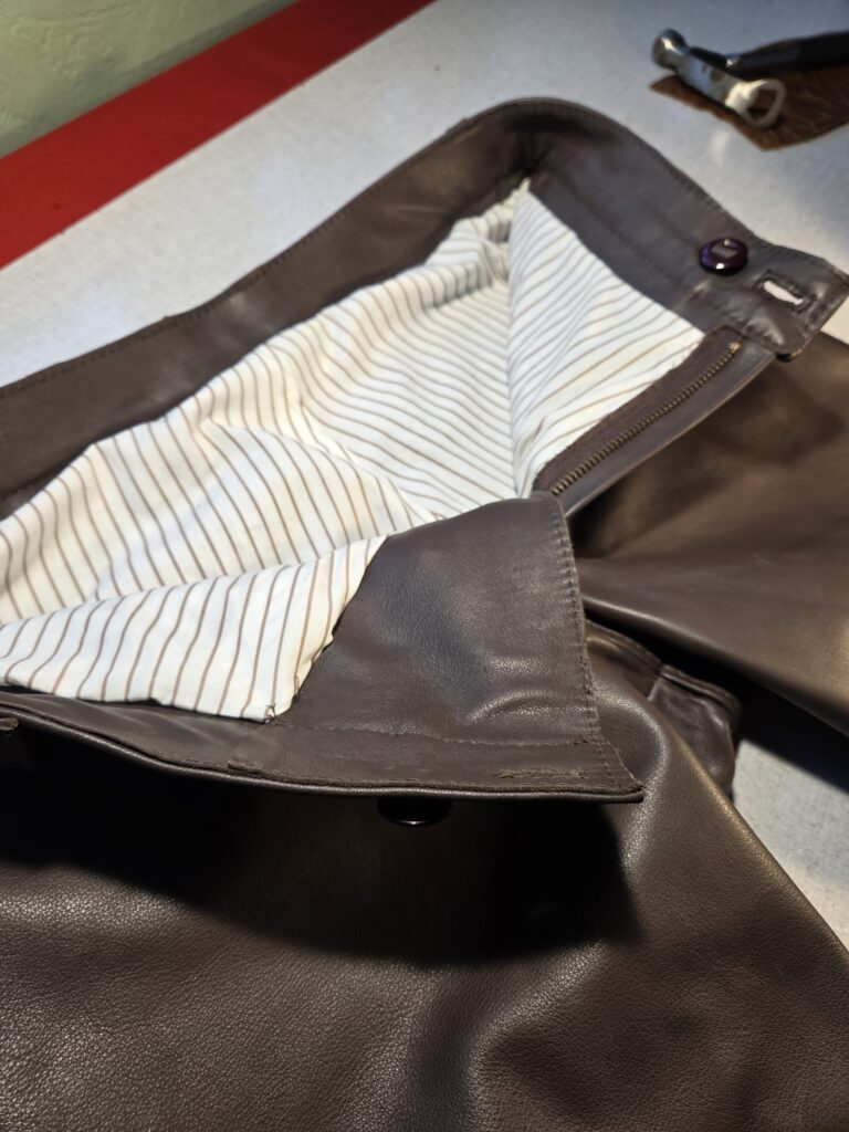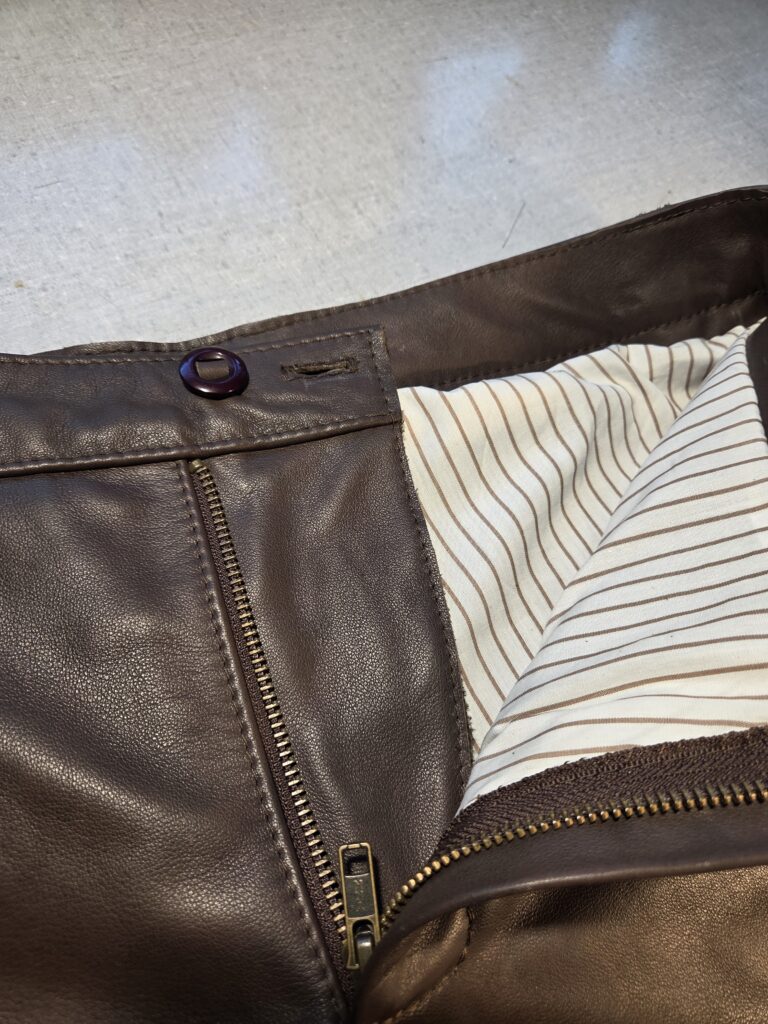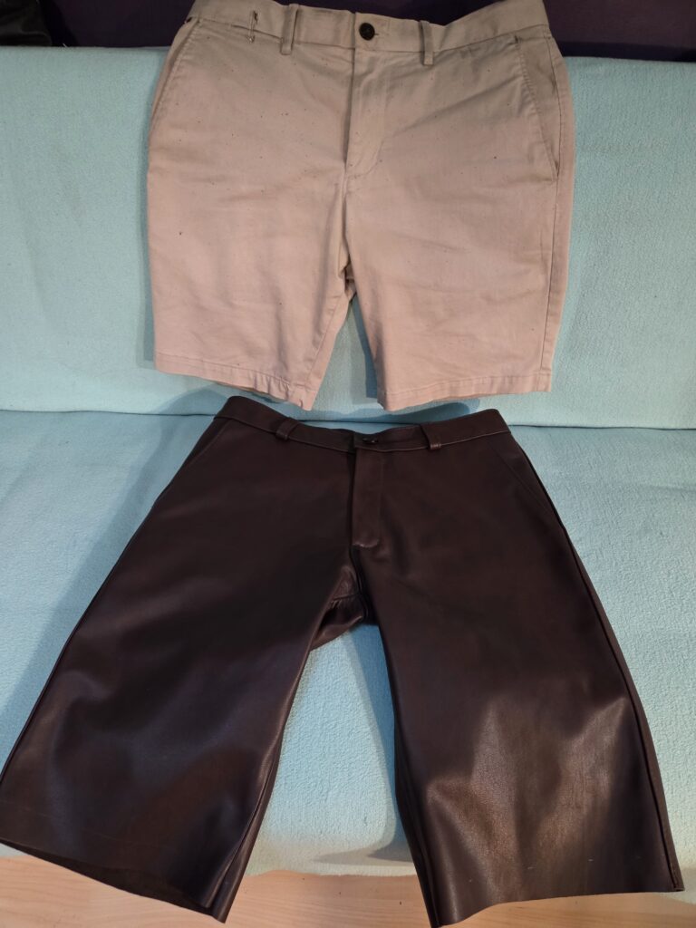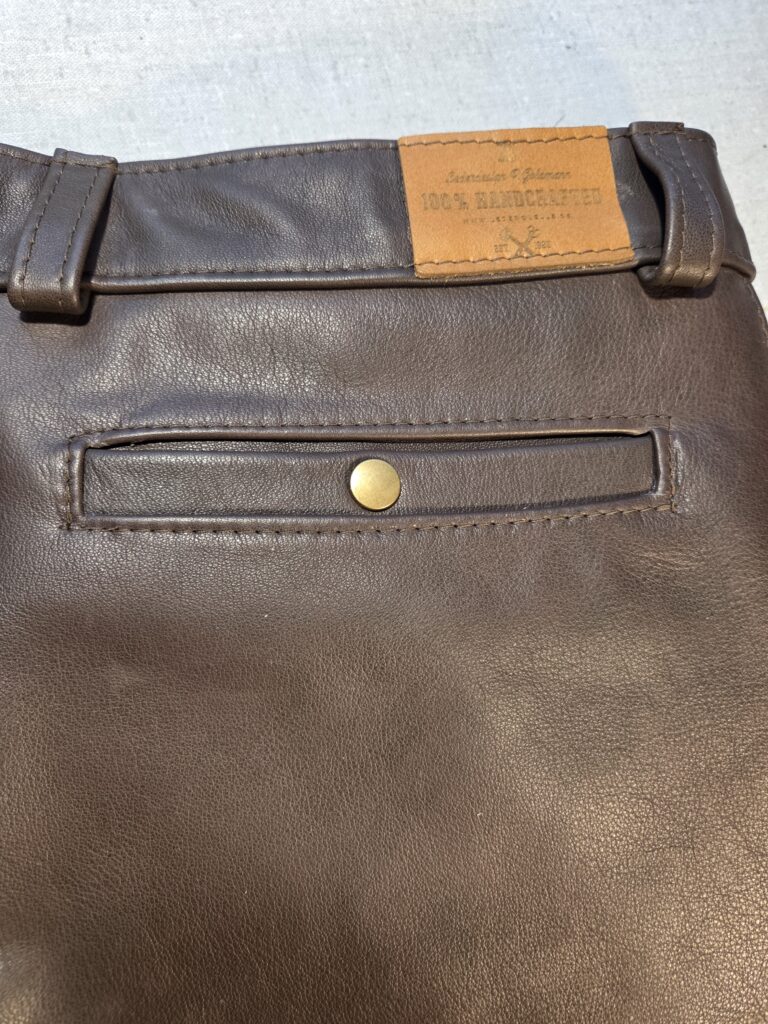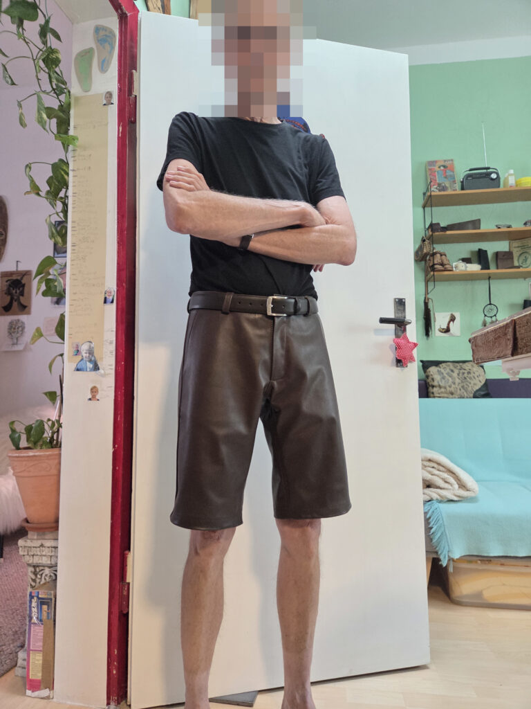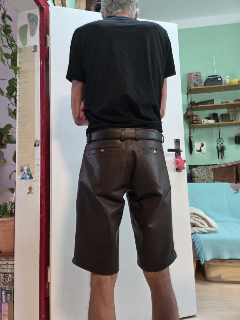 Nach Stoff Vorbild angefertigte kurze Hose aus braunem Rindsleder. Die Beinlänge wird bei Abholung nach Absprache erst umgenäht.